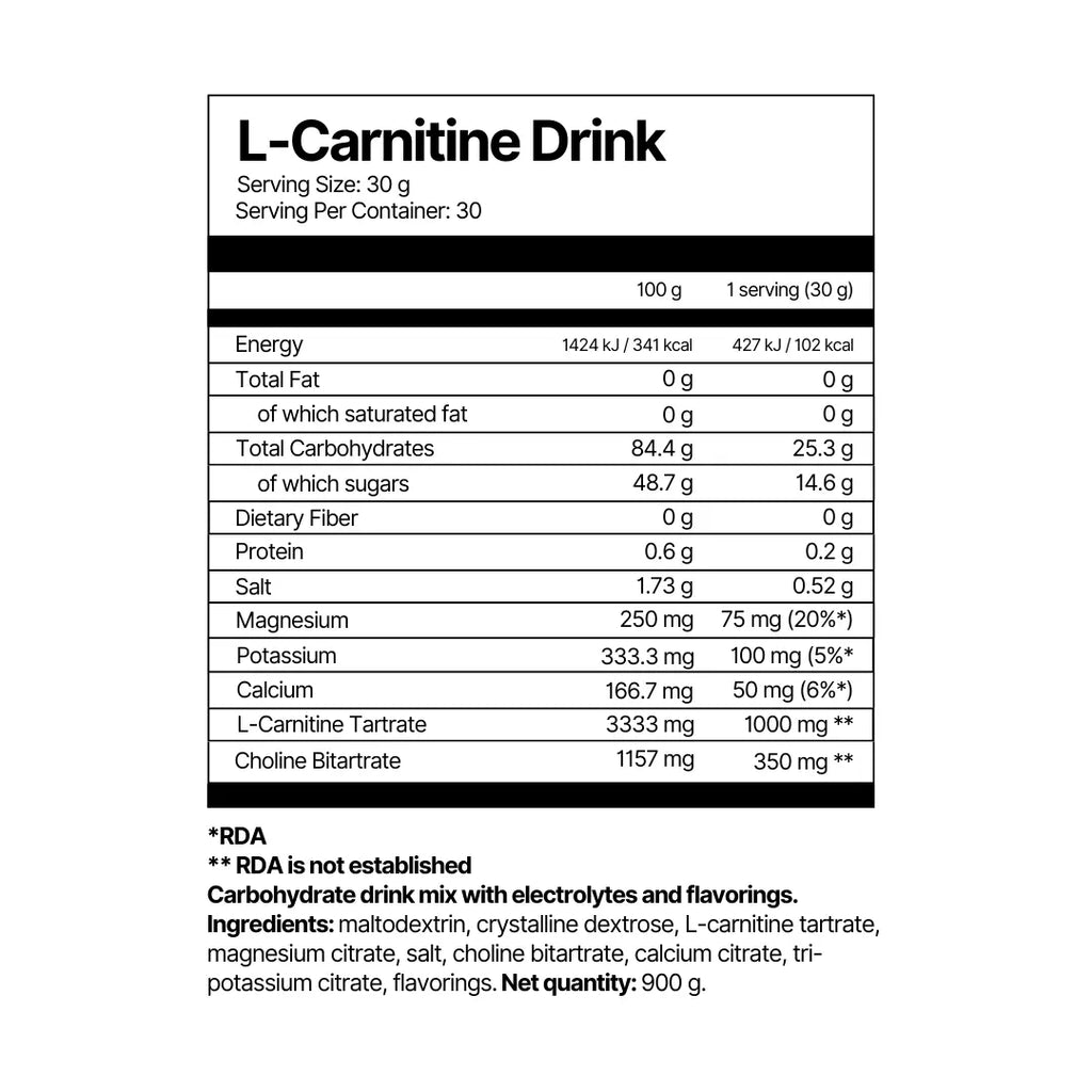 Carbohydrate drink mix with electrolytes and flavorings. Ingredients: maltodextrin, crystalline dextrose, L-carnitine tartrate, magnesium citrate, salt, choline bitartrate, calcium citrate, tri-potassium citrate, flavorings. Net quantity: 900 g.