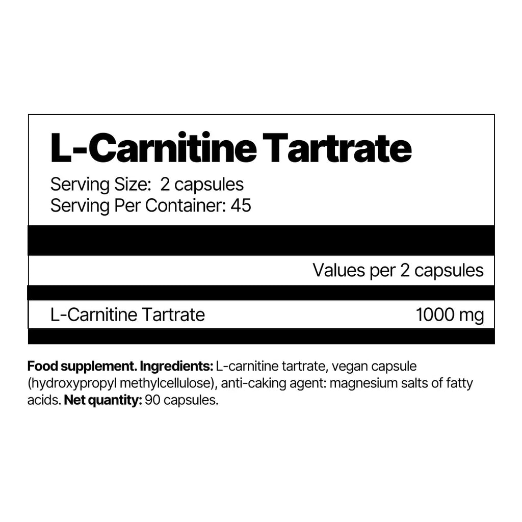 Food supplement. Ingredients: L-carnitine tartrate, vegan capsule (hydroxypropyl methylcellulose), anti-caking agent: magnesium salts of fatty acids. Net quantity: 90 capsules.