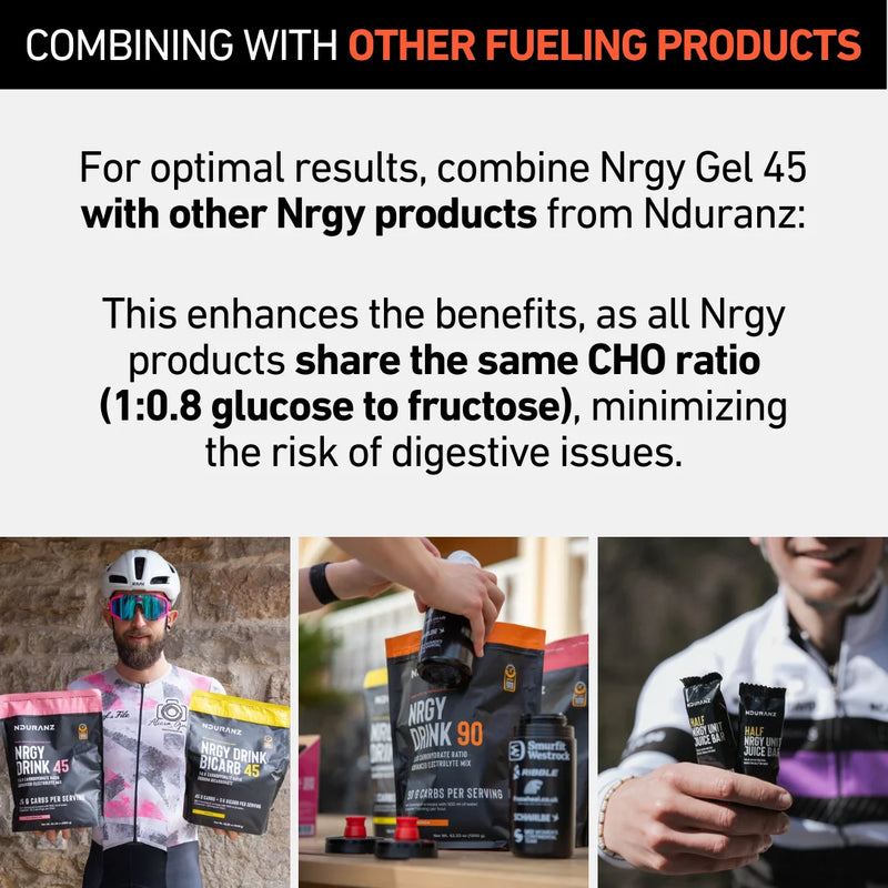 Who should use Nrgy Gel 45?Nrgy Gel 45 is designed for endurance athletes with high energy demands, including cyclists, runners, triathletes, and long-distance athletes. It is particularly suited for long or intense training sessions and races where rapid carbohydrate absorption is critical.