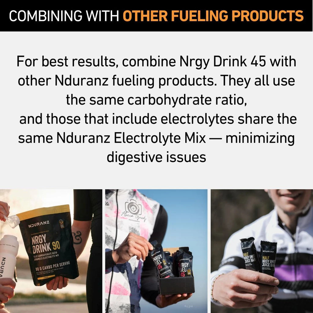 For best results, combine Nrgy Drink 45 with other Nduranz fueling products. They all use the same carbohydrate ratio, and those that include electrolytes share the same Nduranz Electrolyte Mix — minimizing digestive issues.