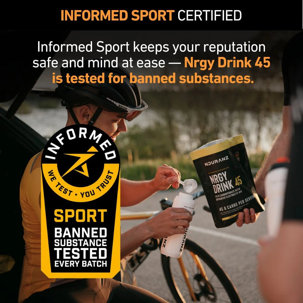 Every batch of Nrgy Drink 45 is tested for banned substances under the Informed Sport program. That means you can fuel with confidence — your performance stays clean and your reputation safe.